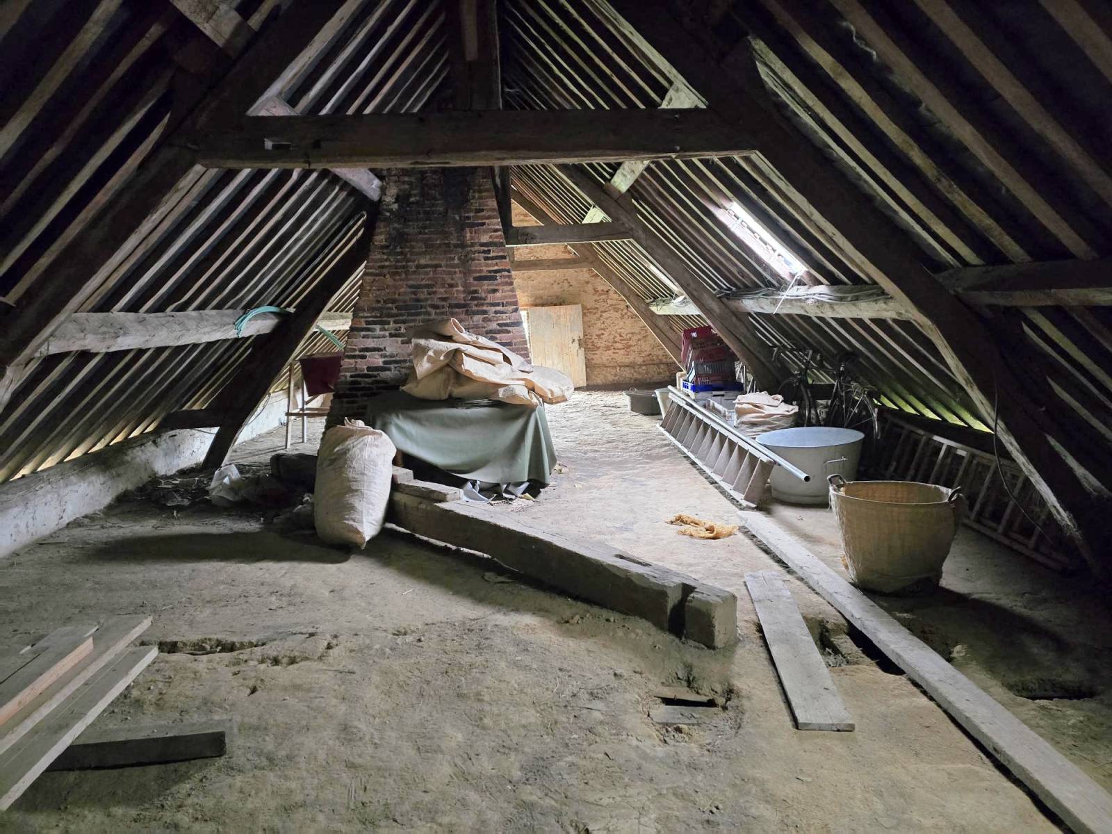 Au dessus : un grenier aménageable où vous pourrez y créer des chambres et salle de bains supplémentaires. Sa belle largeur permettra de créer facilement un couloir desservant les chambres.