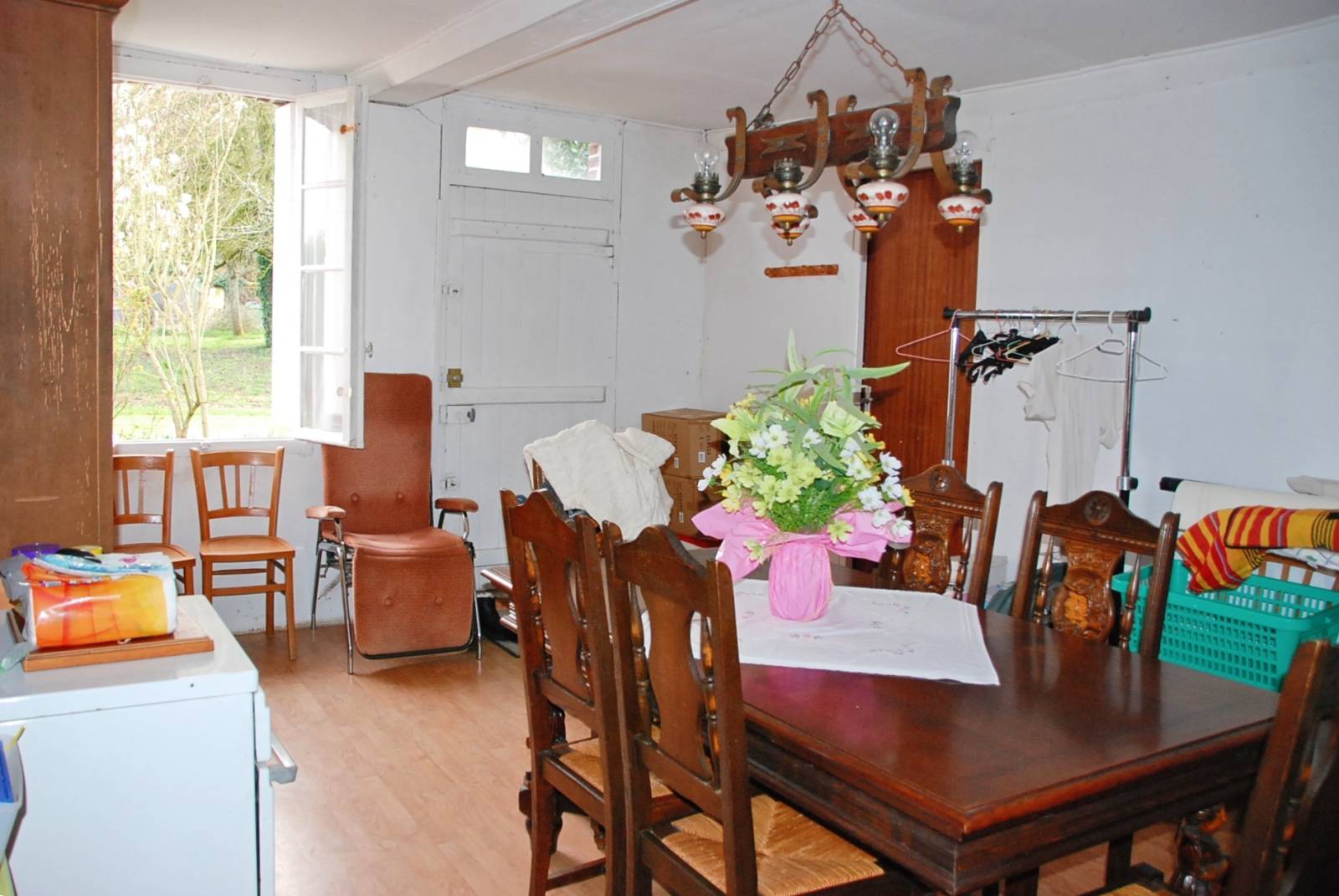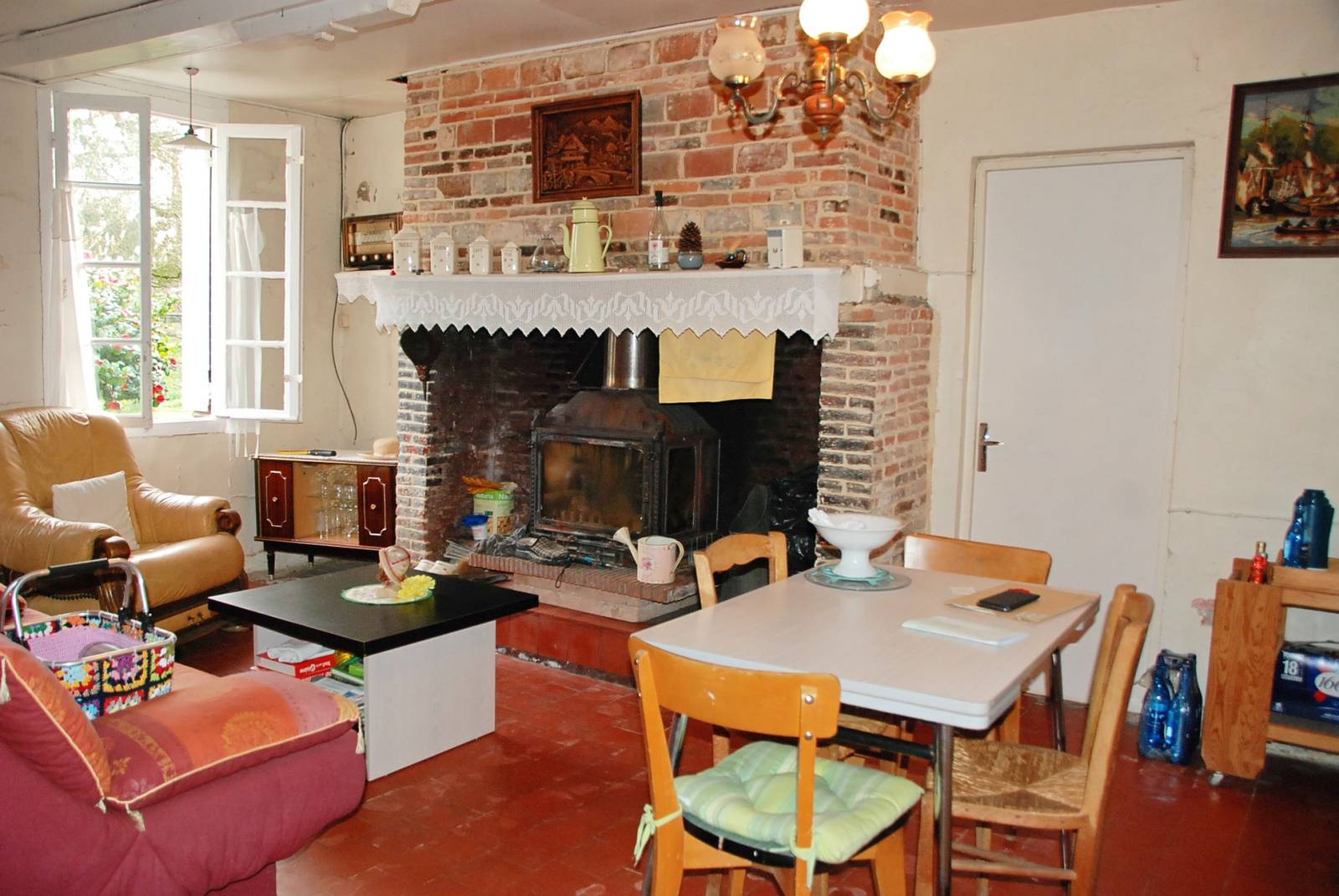 Cuisine ouverte sur la salle à manger avec âtre, salon, une chambre, salle de douche + wc, cellier.